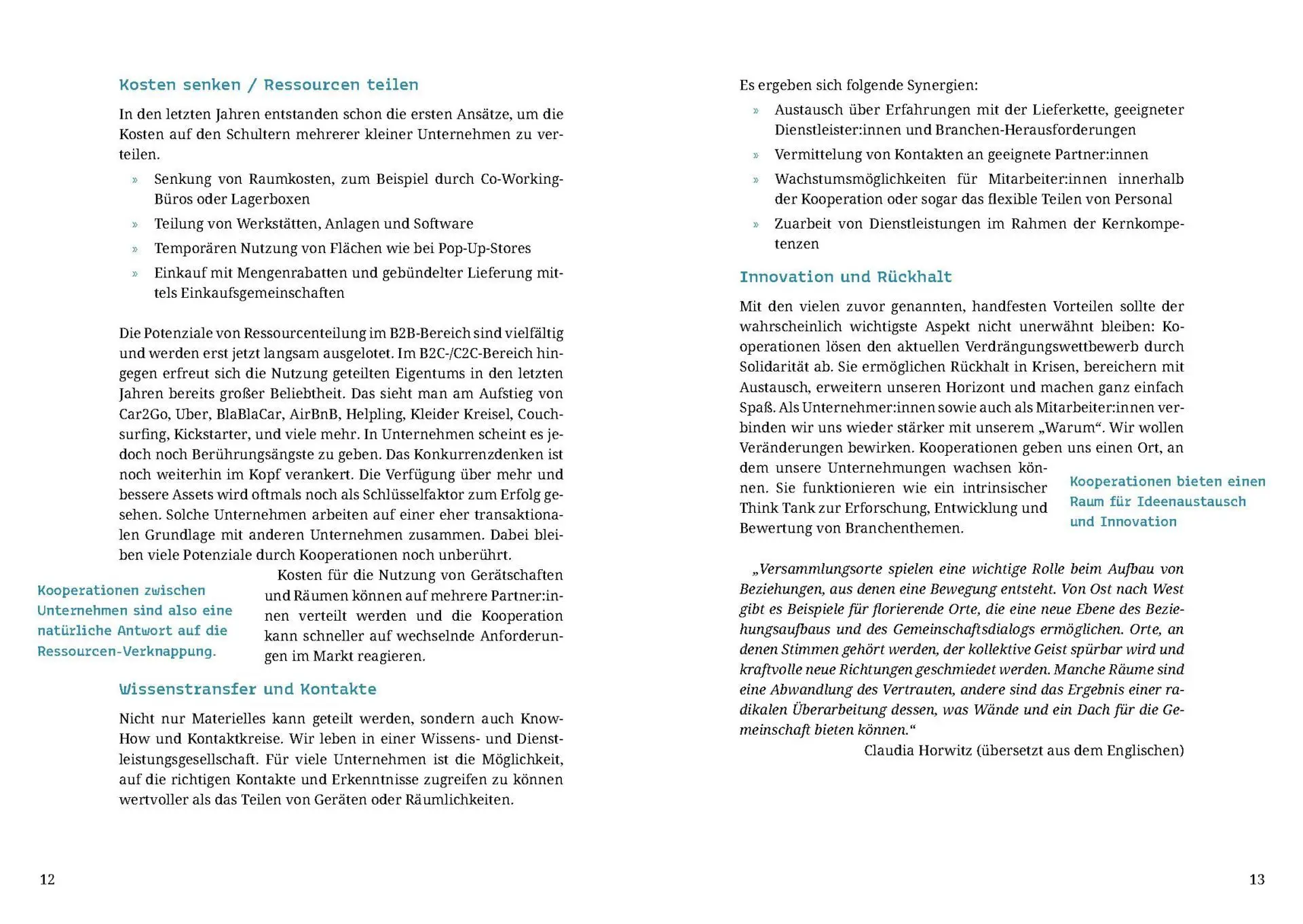 Dieser Ratgeber gibt kleinen Unternehmen einen praxisnahen Überblick über Kooperationsmöglichkeiten – es weist Potenziale und typische Kooperationsformen auf, listet die Kriterien für geeignete Kooperationspartner und gibt konkrete Praxisideen. Auch typische Stolperfallen und ein geeigneter Ablauf für die Abstimmungen werden vorgestellt.
