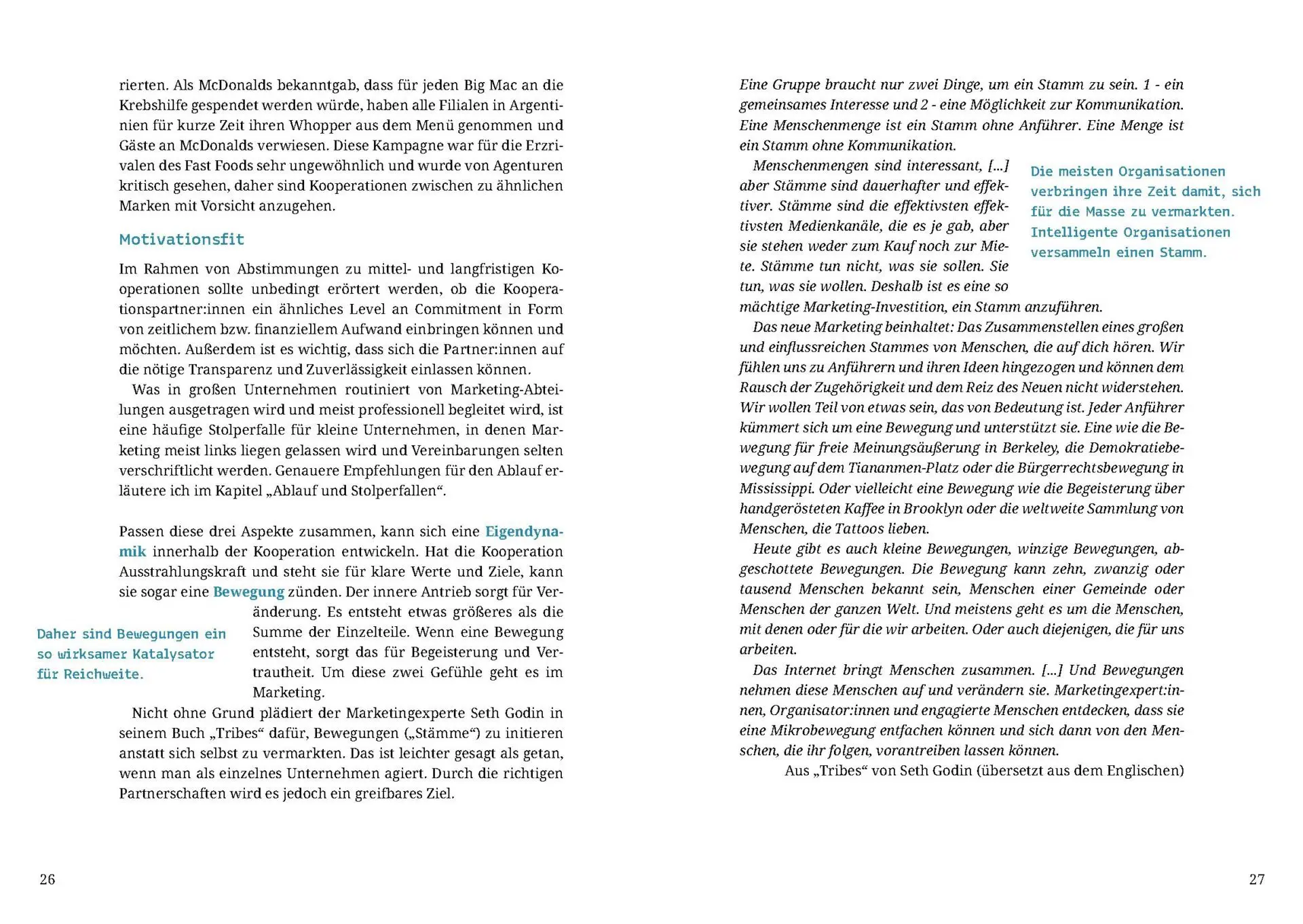 Der Preiskampf ist im vollen Gange. Kleine und mittelständische Unternehmen fokussieren sich zunehmend auf ihre Kernkompetenzen, während die Nachfrage immer spezifischer wird. In diesem Delta entstehen beste Bedingungen für Kooperationen. Die Ellbogenwirtschaft hat in der Postwachstumsökonomie ausgedient – gut vernetzte Unternehmen setzen sich nun durch. Dieses Buch gibt einen Überblick über Formen von Marketing-Kooperationen und Kriterien für passende Partnerschaften. Es enthält außerdem handfeste Tipps für die Umsetzung und zahlreiche Ideen und Fallstudien.
